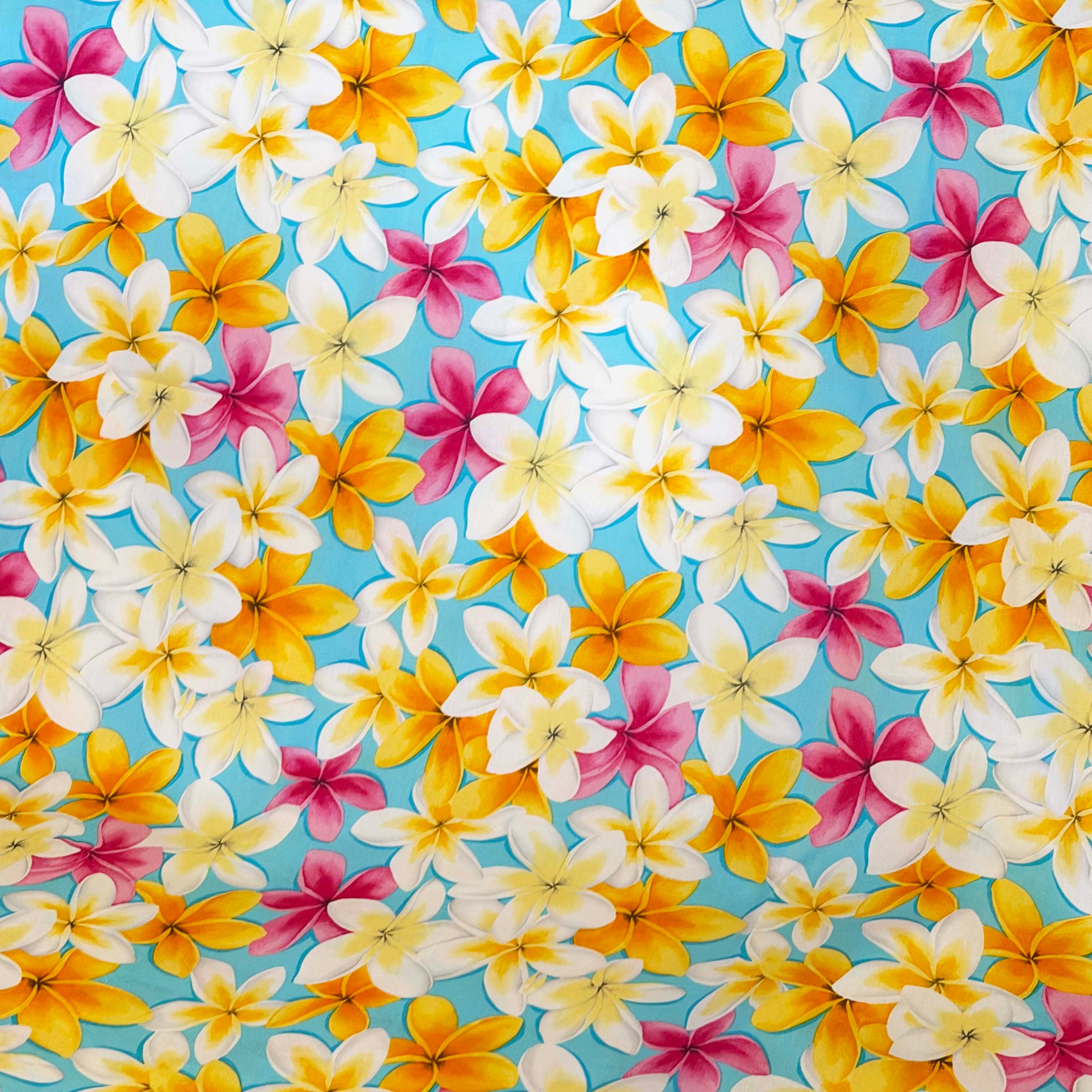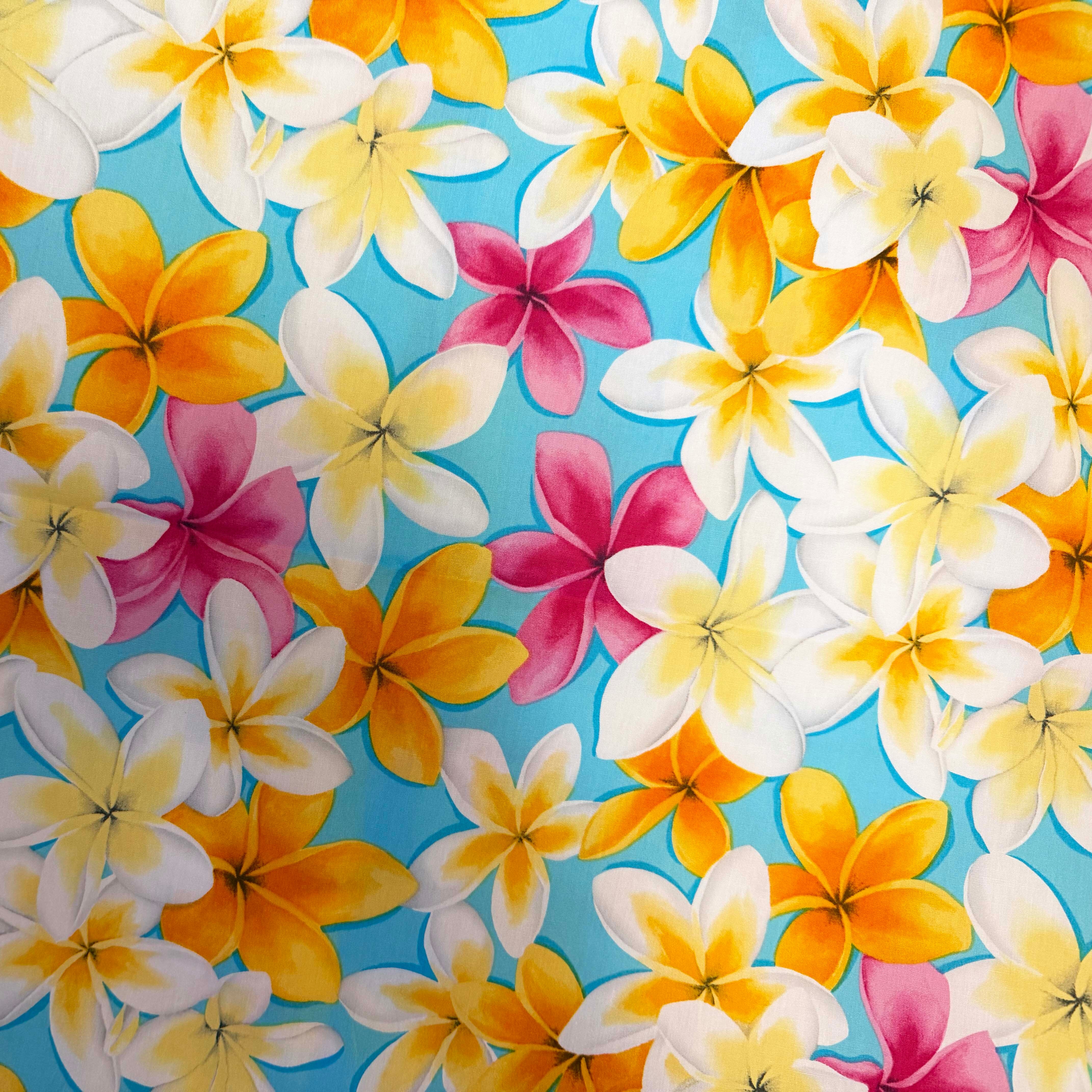 ブルー地にピンク・オレンジ・ホワイトのプルメリア柄